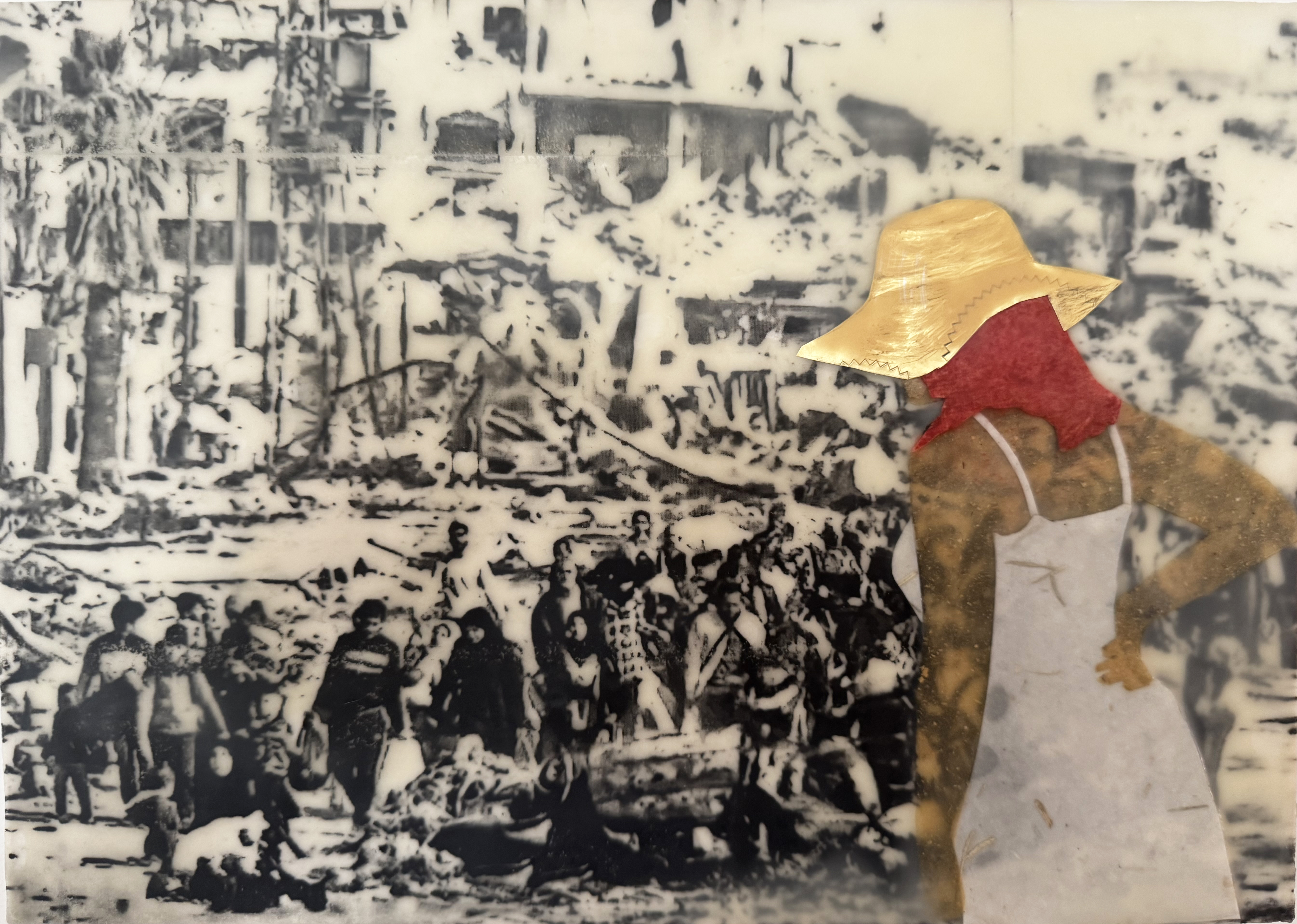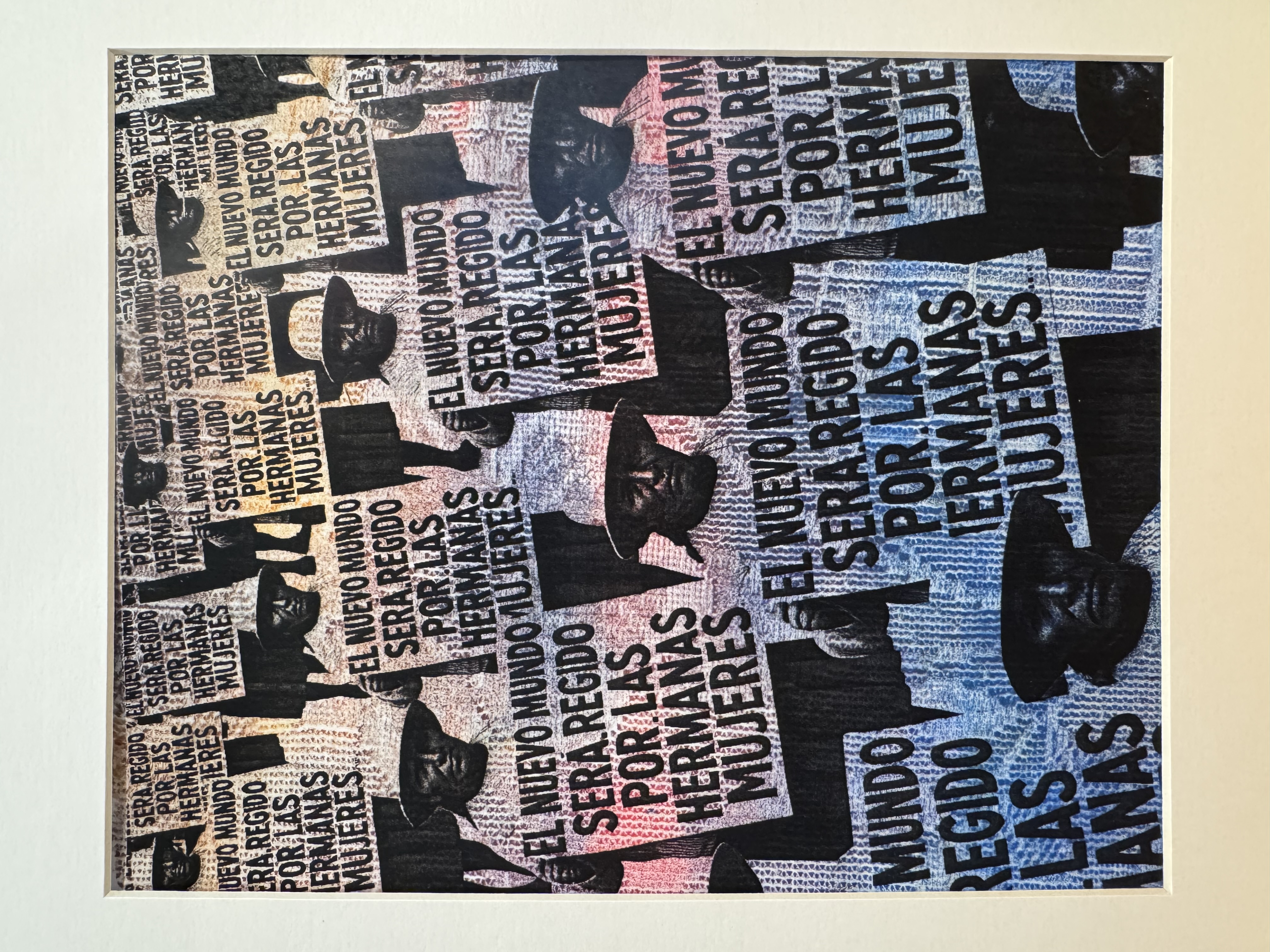 | Spectator (collage/encaustic) Background based on an image from NYTimes | Mujeres y el mundo (image transfer/acrylic monoprint) |